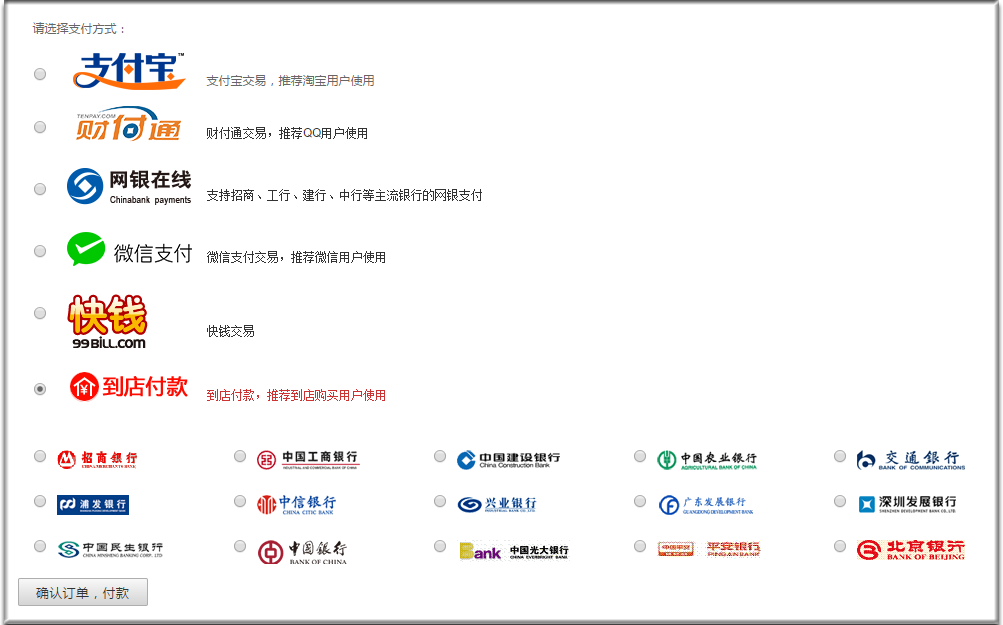 预置多个支付通道, 除支付宝,微支付, 也包括海外paypal, 和财付通, 银行卡直连, 网银在线等.